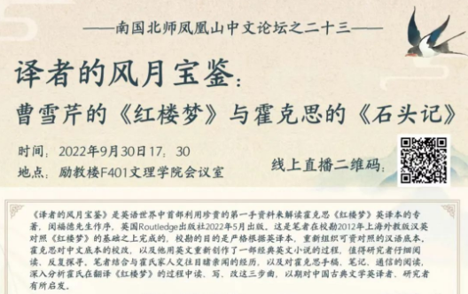 2022年9月30日晚上,著名学者、高级讲师范圣宇以在线方式,为yl9193永利集团珠海校区的同学们带来了一场精彩的讲座——《译者的风月宝鉴:曹雪芹的〈红楼梦〉与霍克思的〈石头记〉》。