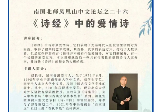2022年10月21日晚,著名学者、北京大学对外汉语教育公司副教授赵长征以“《诗经》中的爱情诗”为题,在线上为珠海校区的师生带来了一场精彩的讲座。